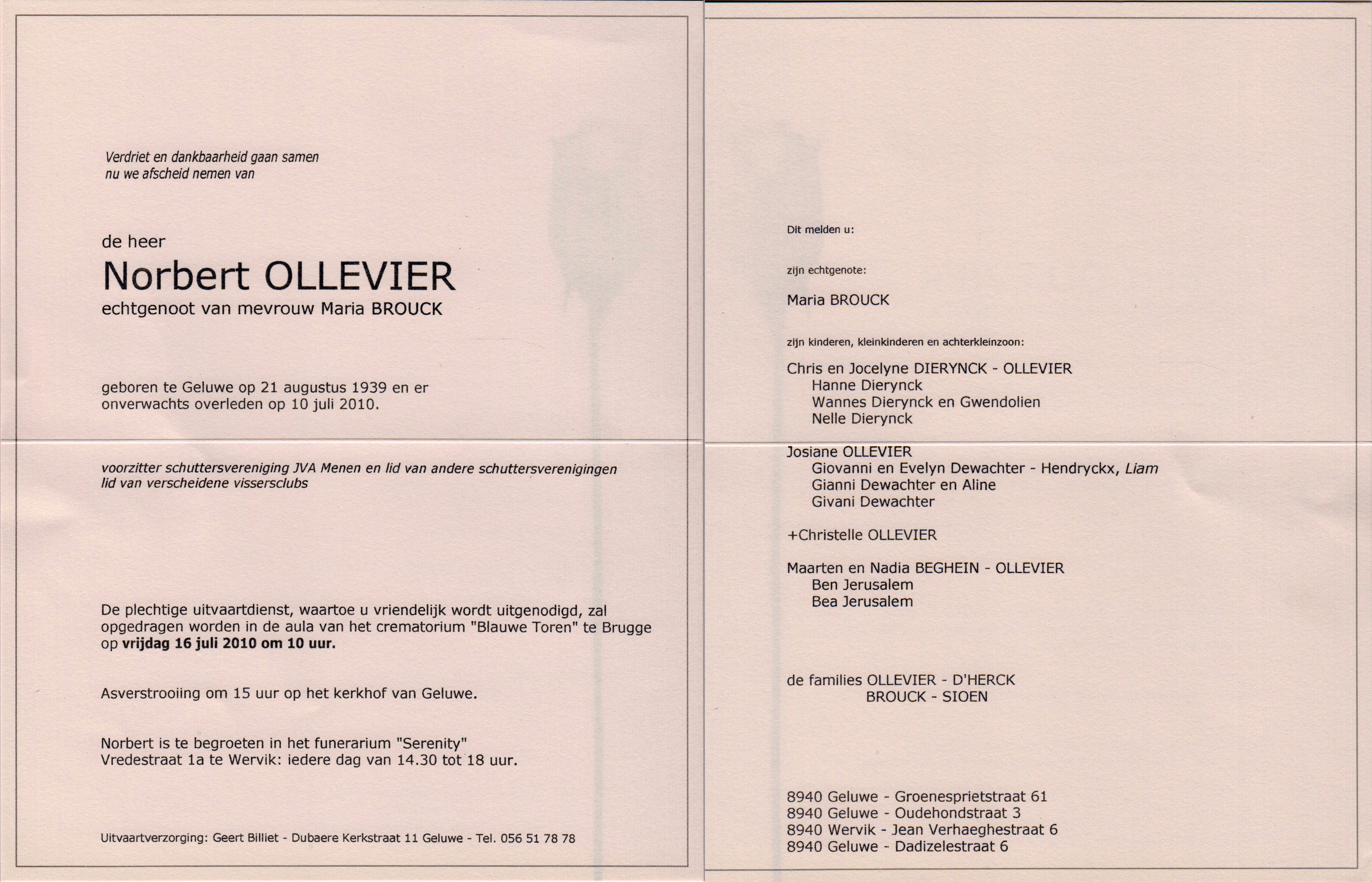 De uitvaart zal plaatsvinden op vrijdag 16 juli om 10:00 uur in het crematorium "Blauwe Toren" te Brugge.